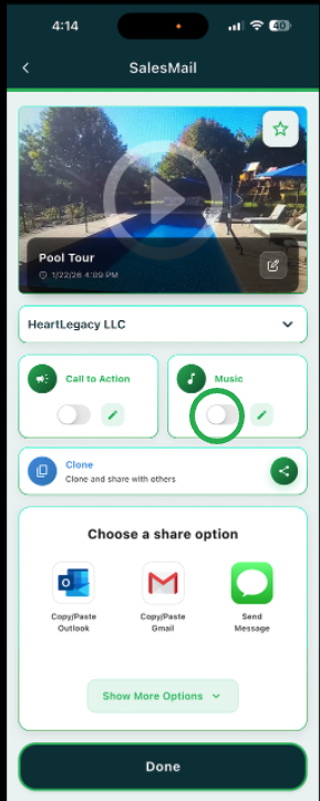 Weāre thrilled to announce you can now add music to your SalesMail videos using either the SalesMail Portal or the SalesMail mobile app! Whether you're enhancing a silent video tour or adding subtle background music to a narrated message, this feature brings a whole new level of polish to your contentāfast and easy.