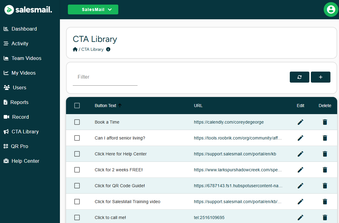 SalesMail Desktop Portal is a place to store frequently used CTA button templates so that you can easily choose from them when you you want to add a CTA button to a SalesMail video. Any button templates you save in this library are available for you to quickly add to a SalesMail video from the share page in the SalesMail mobile app or desktop portal. This article walks through how to use the CTA Library and how to add CTA buttons from the CTA Library to your videos