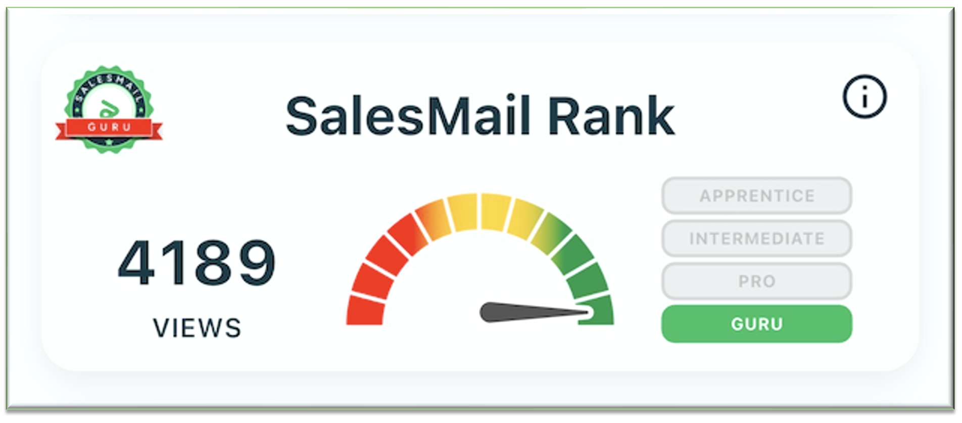 Once you hit 500 all-time views on your videos, you earn the SalesMail Guru rank — a milestone that deserves recognition! 🙌 You can check to see if you have reached this rank on your SalesMail dashboard in the portal or mobile app.