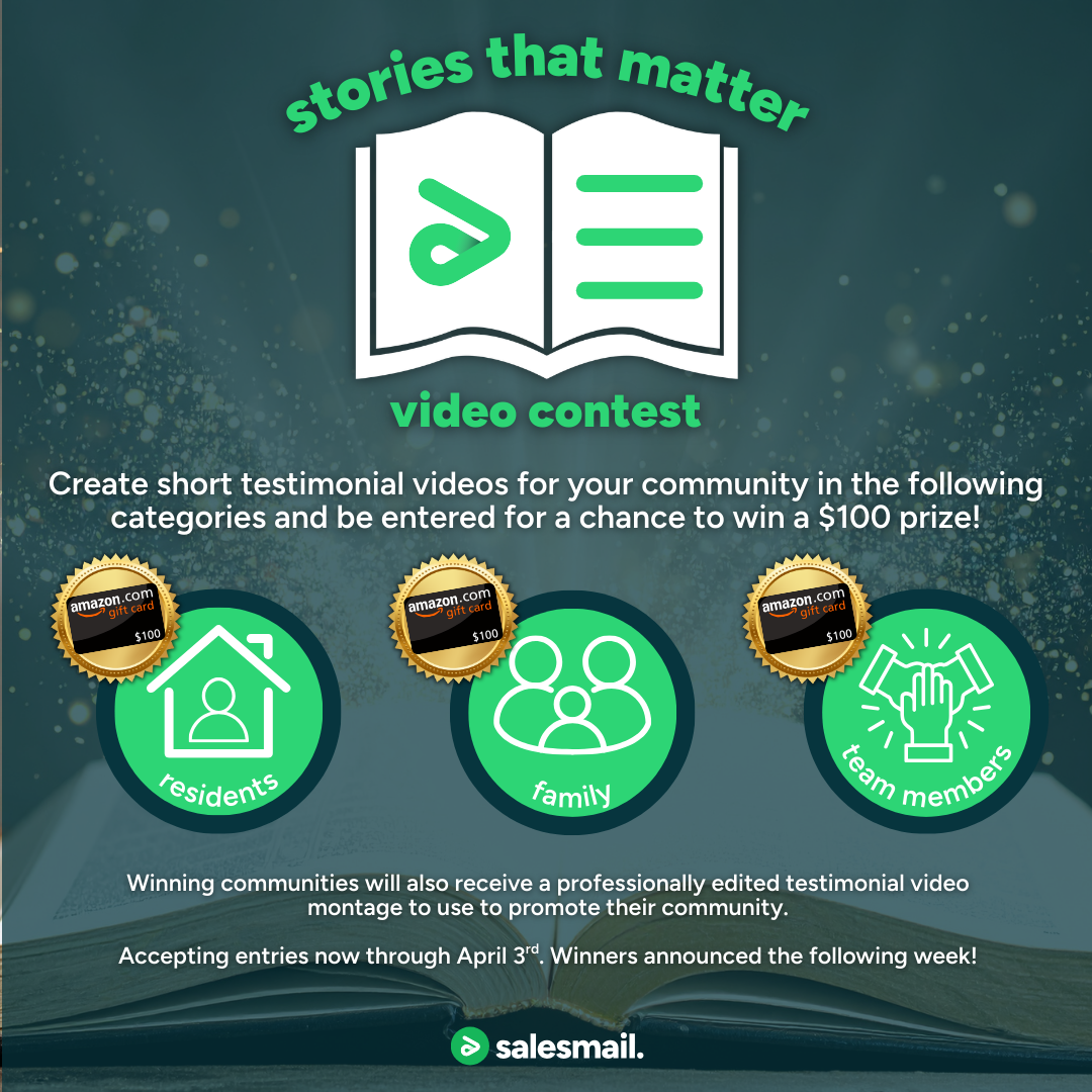 The Stories That Matter Video Contest is your chance to capture those moments using SalesMail by recording short testimonial-style videos that highlight what makes your community special.